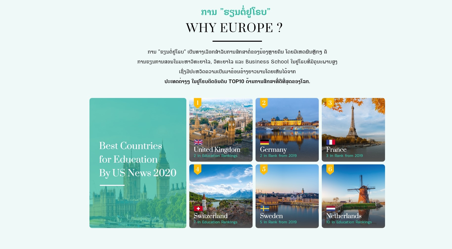 Switzerland ສະວິດເຊີແລນ ນ້ອງໆ ຫຼາຍຄົນຕັ້ງໃຈວາງ ແຜນເພື່ອໄປຮຽນຕໍ່ສະວິດເຊີແລນ ໂດຍສາຂາທີ່ເປັນທີ່ນິຍົມເປັນ ສາຂາການໂຮງແຮມ, ການເງິນ, ການບໍລິຫານທຸລະກິດ ແລະ ພົວພັນຕ່າງປະເທດ. ລາຄາຄ່າຮຽນຈະຂ້ອນຂ້າງສູງເມື່ອທຽບກັບປະເທດອື່ນໃນຢູໂຣບ |